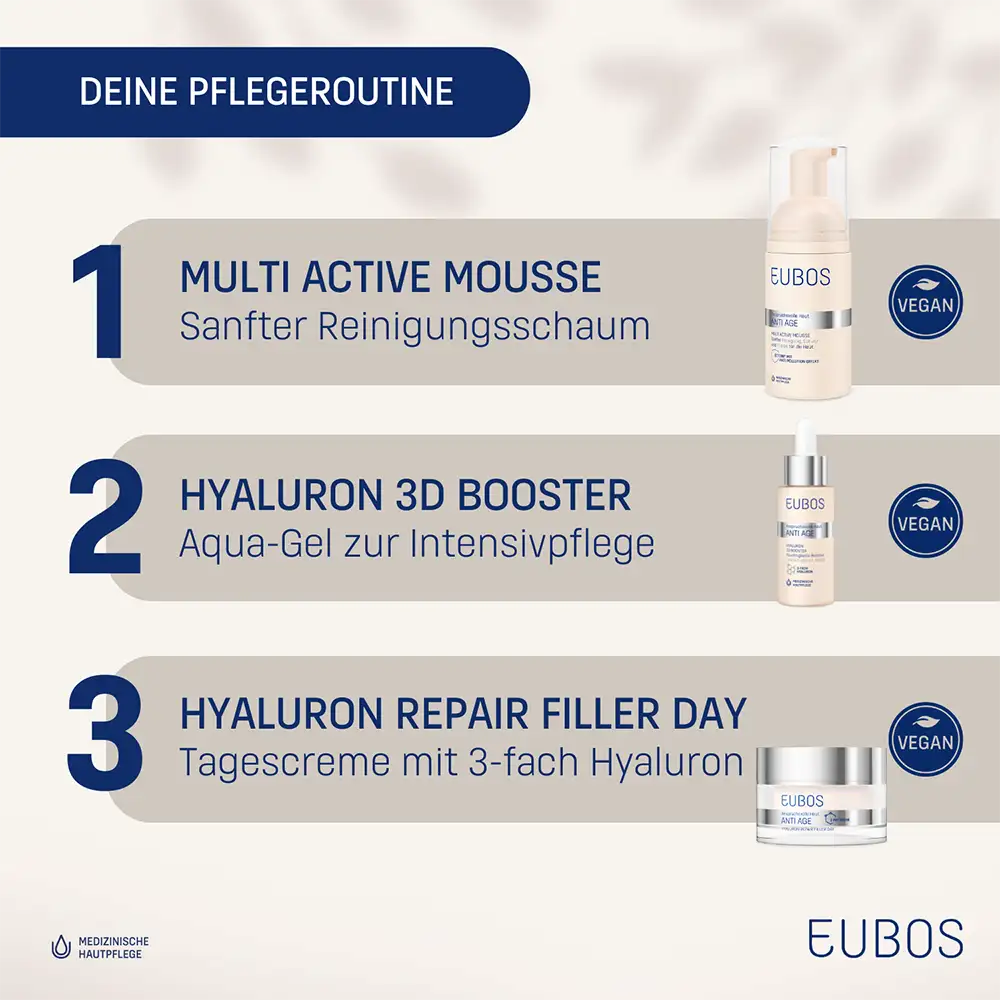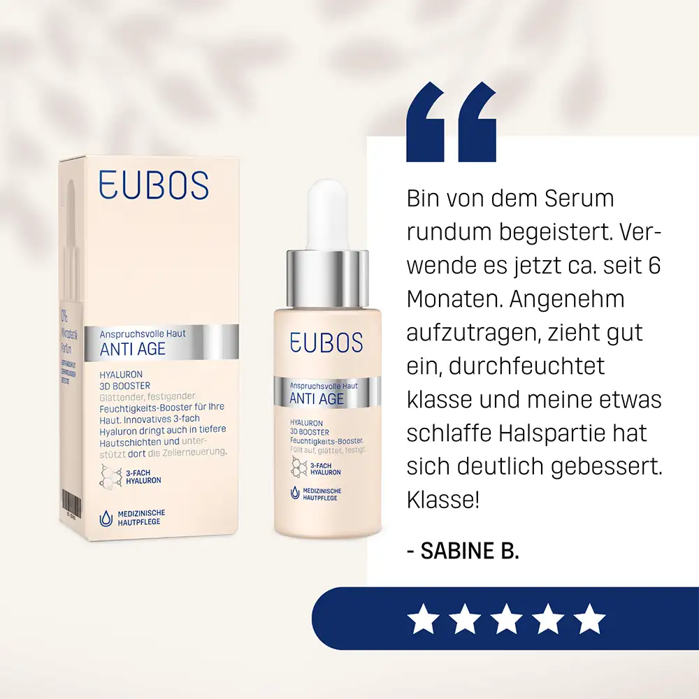 I prodotti contrassegnati come MIX & MATCH, sono ideali come trattamento complementare all’interno della routine quotidiana. EUBOS ANTI-AGE 3D BOOSTER può essere applicato sotto la crema EUBOS ANTI-AGE REPAIR FILLER DAY. La tollerabilità è dermatologicamente testata. Tutti i prodotti dell’azienda familiare Dr. Hobein con il marchio EUBOS sono realizzati da oltre 90 anni in Germania e continuamente sviluppati secondo le più recenti conoscenze scientifiche.
