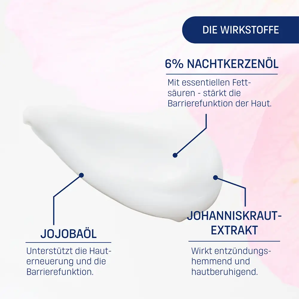 - 6% di olio di Enotera con acidi grassi essenziali, fondamentali per il supporto alla funzione di barriera naturale della pelle