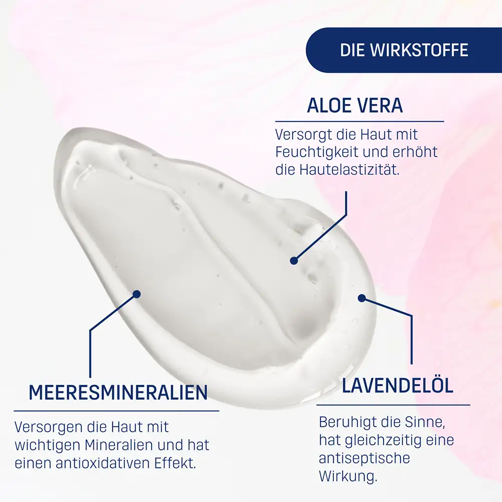 - Con minerali marini e gel di Aloe Vera, aiuta a calmare la pelle; l’olio di Lavanda favorisce una sensazione di rilassamento