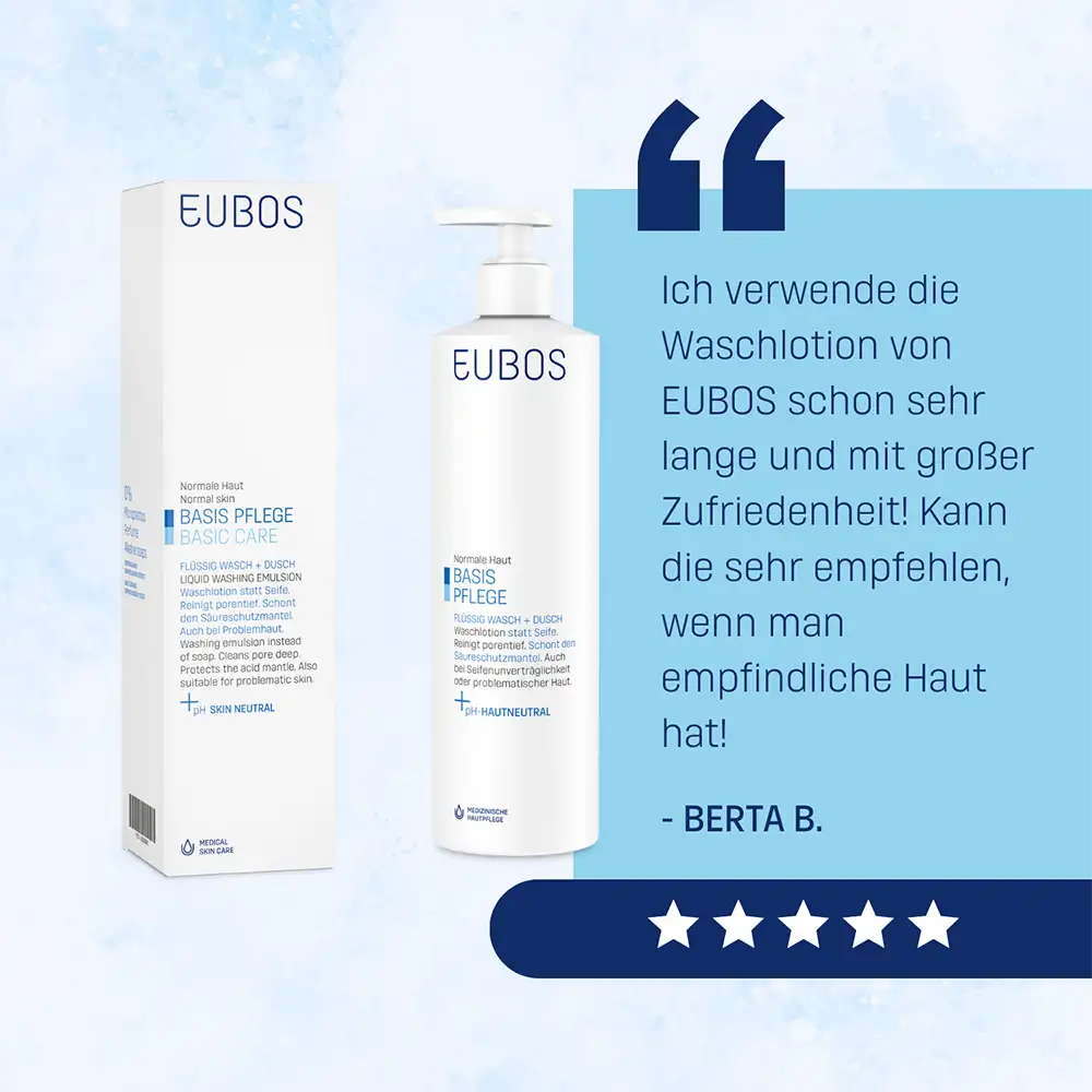 I Natural Moisturizing Factors (NMF), o fattori idratanti naturali, sono sostanze presenti nella pelle che aiutano a trattenere l’acqua e a mantenerla all’interno delle cellule cutanee. I fattori idratanti naturali contenuti in EUBOS BASE DETERGENTE LIQUIDO supportano l’azione degli NMF della pelle, contribuendo a mantenere il corretto livello di idratazione.