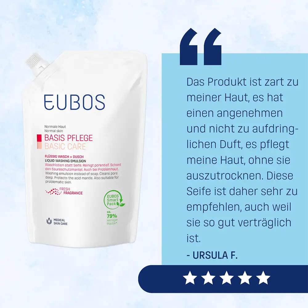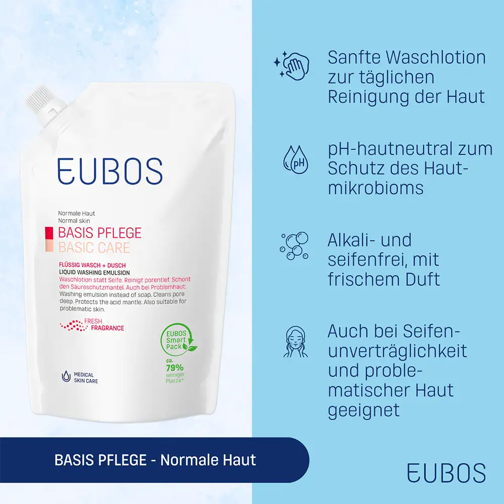 Il sapone può alterare il naturale mantello acido protettivo della pelle, fondamentale per proteggerla dalle aggressioni esterne. EUBOS BASE DETERGENTE LIQUIDO PROFUMATO, nel formato ecoricarica, è senza sapone e, grazie al pH neutro per la pelle, aiuta a rispettare il mantello acido protettivo. Per una detersione delicata ma accurata, contiene tensioattivi delicati. È quindi adatto anche in caso di pelle problematica o impura, anche a supporto di misure terapeutiche. Con l’uso regolare, l’Allantoina contribuisce ad attenuare le sensazioni di fastidio cutaneo, mentre un fattore idratante naturale aiuta a mantenere la pelle idratata. EUBOS BASE DETERGENTE LIQUIDO PROFUMATO ECORICARICA è privo di microplastiche e saponi alcalini. La tollerabilità cutanea è dermatologicamente testata. Il pratico formato ecoricarica da 400 ml è fino al 20% più conveniente rispetto alla stessa quantità in due flaconi da 200 ml. Inoltre, riduce l’uso di plastica: fino al 79% in meno rispetto a 2 flaconi da 200 ml con tappo. Tutti i prodotti Eubos dell’azienda familiare Dr. Hobein, specializzati in trattamenti dermocosmetici della pelle, sono prodotti in Germania dal 1930 e costantemente sviluppati secondo le più recenti acquisizioni scientifiche.