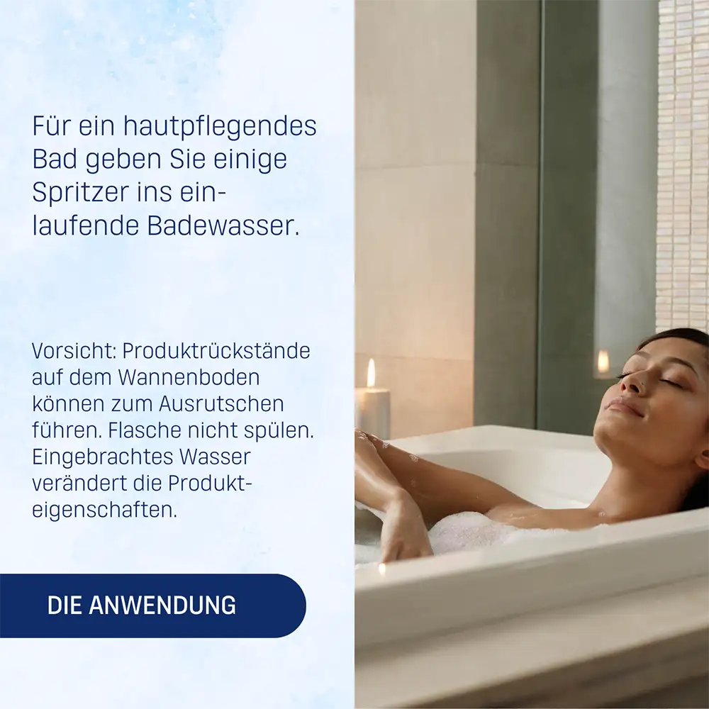 Per un bagno emolliente, aggiungere una piccola quantità di prodotto nell’acqua mentre la vasca si riempie. Non fare il bagno per più di 5–7 minuti a una temperatura di 36 °C. Agitare prima dell’uso. Fare attenzione quando si entra nella vasca, perché eventuali residui del prodotto possono rendere il fondo scivoloso.