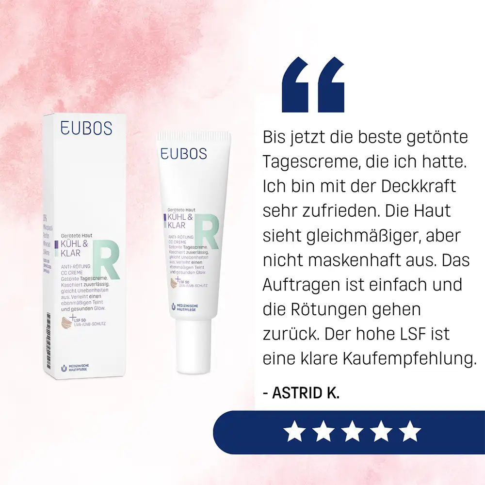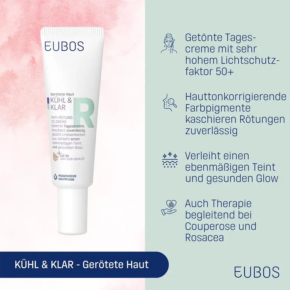 In caso di rosacea e couperose, EUBOS CALMA E SOLLIEVO CC CREAM ANTI-ROSSORI SPF 50 assicura un incarnato uniforme: i pigmenti colorati della crema coprente mimetizzano in modo affidabile gli arrossamenti. Allo stesso tempo, il complesso fito-attivo fortifica la pelle reattiva. Ectoin fornisce idratazione e riempie visibilmente le piccole rughe. EUBOS CALMA E SOLLIEVO CC CREAM ANTI-ROSSORI SPF 50 offre inoltre una protezione ad ampio spettro SPF 50+ contro i raggi UVA e UVB, che possono favorire e scatenare la rosacea. Tutti i prodotti dell’azienda familiare Dr. Hobein del marchio EUBOS, sono realizzati in Germania da oltre 90 anni e continuamente sviluppati secondo le più recenti conoscenze scientifiche.