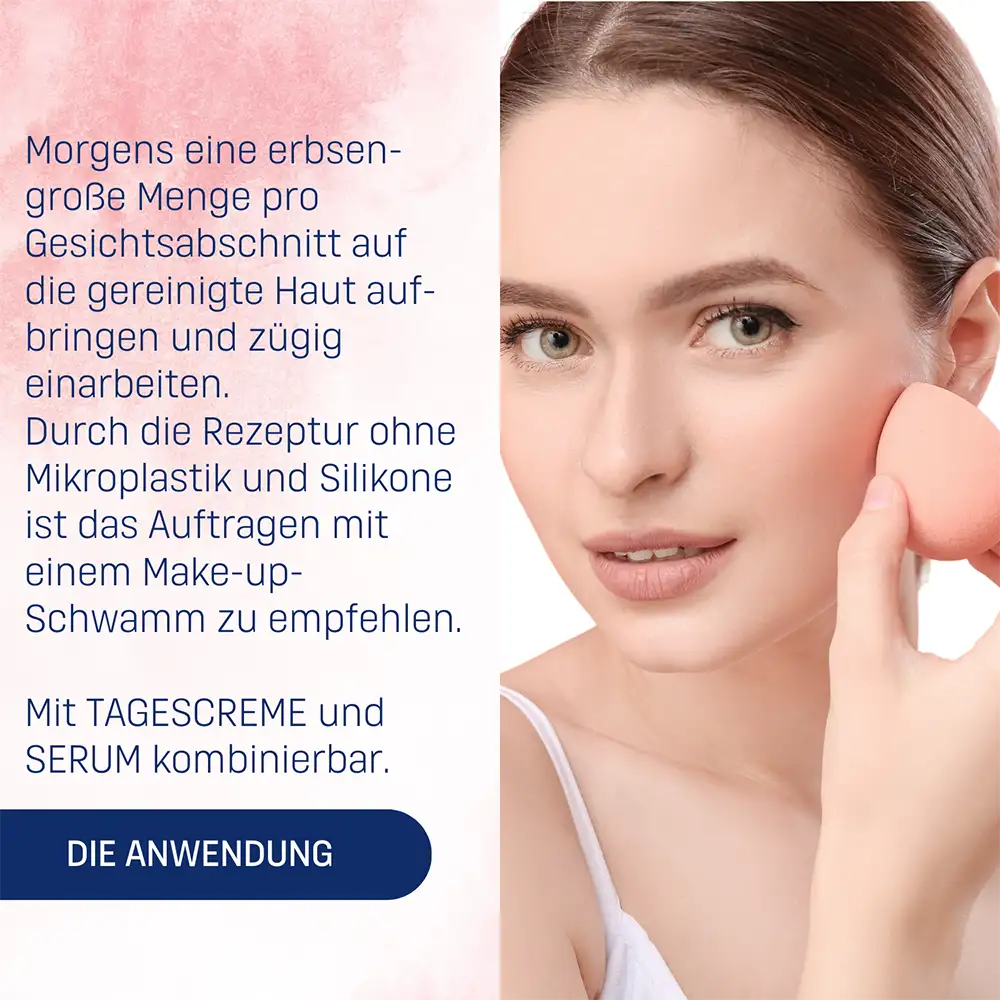 Al mattino, applicare sulla pelle detersa una piccola quantità per ogni zona del viso, distribuendola rapidamente senza utilizzare primer o altre basi make-up. Grazie alla formulazione priva di microplastiche e siliconi, l’applicazione può essere eventualmente facilitata con una spugnetta da make-up. Può essere combinata con crema giorno e siero.