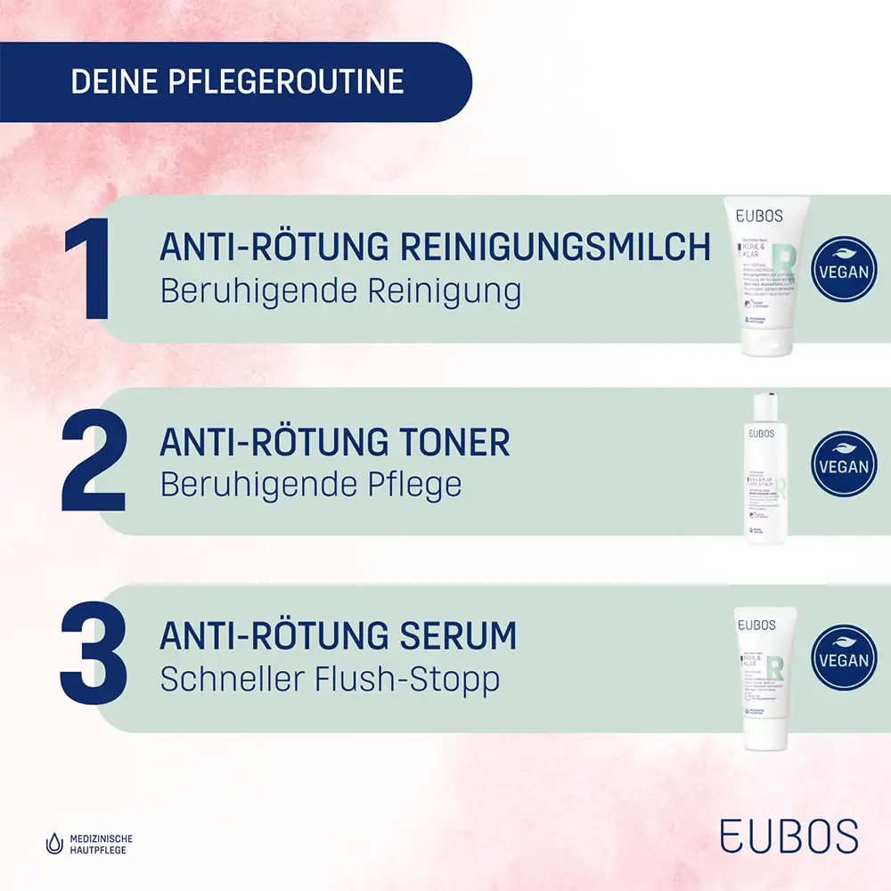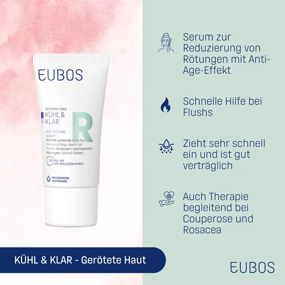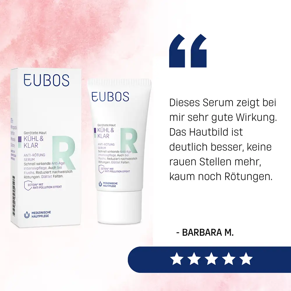 In caso di flush e pelle molto sensibile e reattiva, EUBOS CALMA E SOLLIEVO SIERO ANTI-ROSSORI offre una rapida sensazione di comfort. Ectoin, molecola naturale di protezione dallo stress, contribuisce a uniformare il colorito, stabilizzando le membrane cellulari e i lipidi della pelle. Il complesso fitoattivo con Immortelle dona una sensazione di freschezza e comfort e contribuisce a migliorare l’aspetto della pelle. Il siero è anche un trattamento anti-age che, grazie ai suoi attivi delicati, è indicato come coadiuvante nelle pelli tendenti alla rosacea e couperose. Apporta idratazione duratura e contribuisce a rendere la pelle più levigata, attenuando visibilmente le piccole rughe dall’interno. EUBOS CALMA E SOLLIEVO SIERO ANTI-ROSSORI è un trattamento cosmetico specialistico a rapido assorbimento, ideale in abbinamento a EUBOS CALMA E SOLLIEVO CREMA GIORNO ANTI-ROSSORI o CREMA INTENSIVA ANTI-ROSSORI. Ha un pH neutro, è vegano, dermatologicamente testato e si può affiancare alla terapia in caso di rosacea. Tutti i prodotti della Dr. Hobein con il marchio EUBOS sono realizzati in Germania da oltre 90 anni e sviluppati costantemente secondo le più recenti evidenze scientifiche.