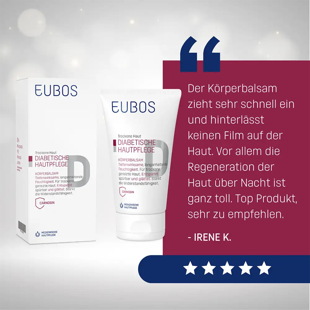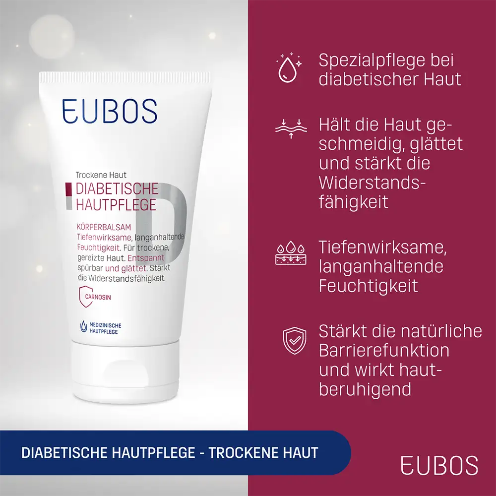 In caso di diabete mellito, la pelle necessita di un trattamento specifico: EUBOS PELLE DIABETICA BALSAMO CORPO supporta la pelle secca e sensibile, la rende più liscia e morbida e rafforza la sua resistenza.