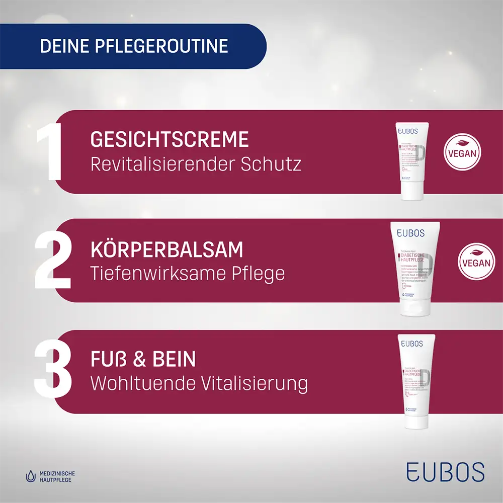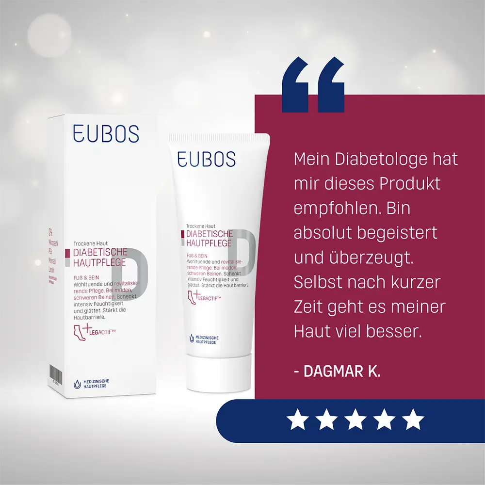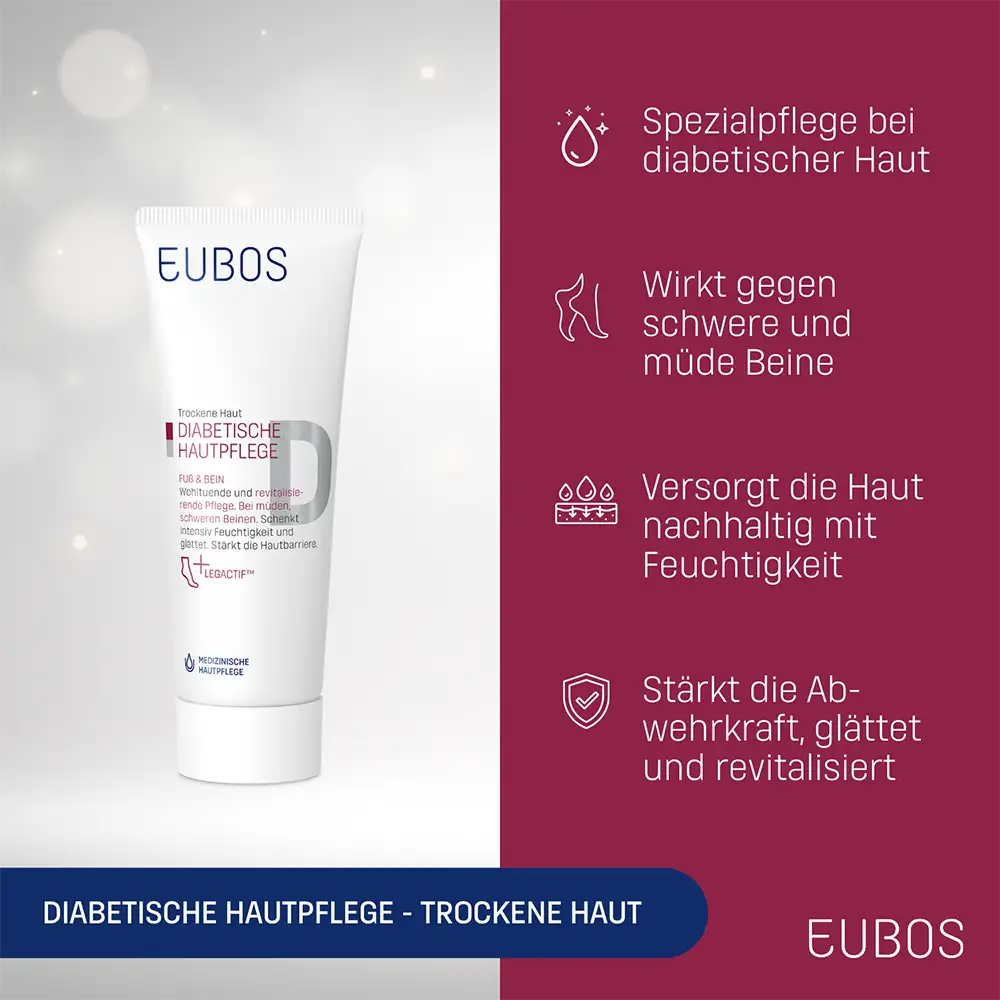 In caso di diabete mellito, la pelle è spesso secca, sensibile e più soggetta a infiammazioni. Le gambe risultano spesso pesanti perché i piccoli vasi sanguigni si restringono, causando ristagni. EUBOS PELLE DIABETICA CREMA PIEDI E GAMBE è sviluppata specificamente per queste esigenze: i principi attivi favoriscono il drenaggio, sostengono i vasi sanguigni, forniscono intensa idratazione e rinforzano la barriera cutanea, così che gli agenti esterni non possano penetrare facilmente.