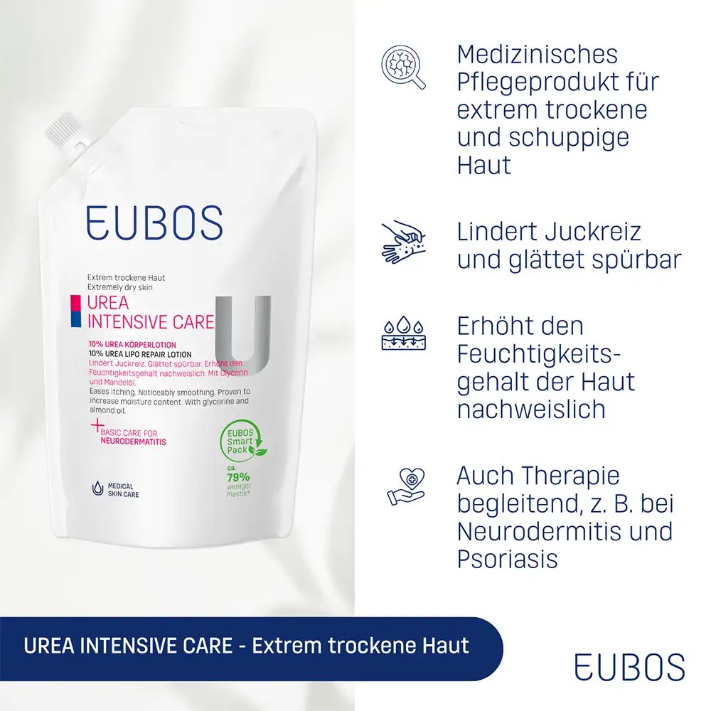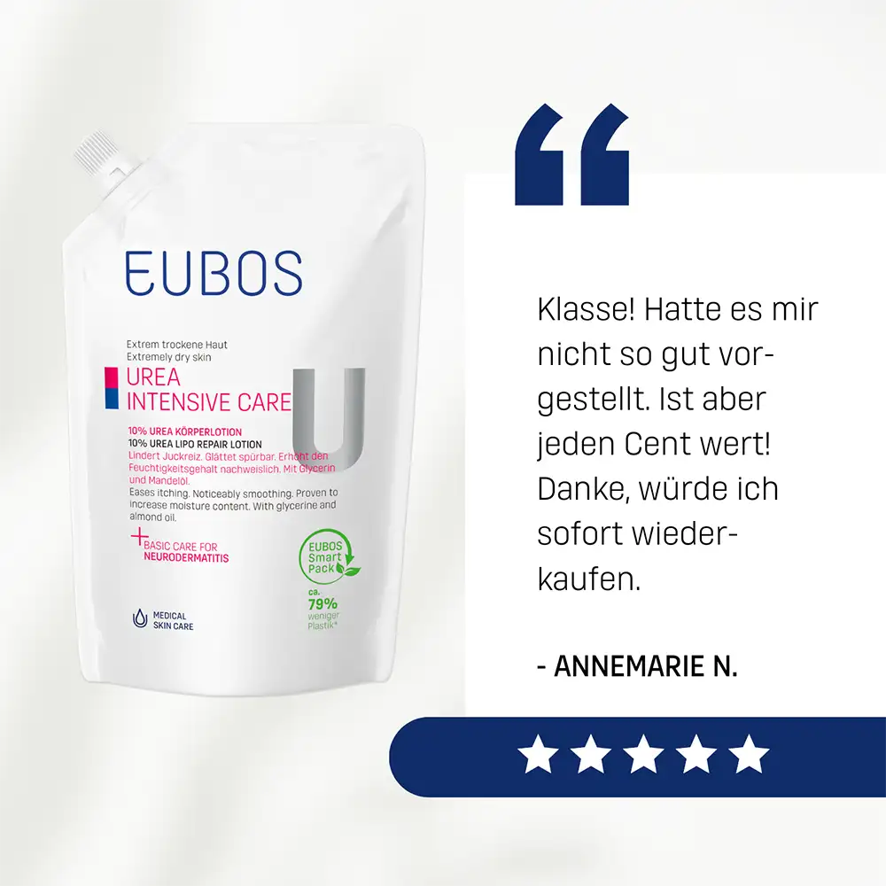 EUBOS UREA EMULSIONE LIPO REPAIR LOTION 10% è formulata per le esigenze della pelle estremamente secca e desquamata, che può risultare irritata, tesa o soggetta a prurito. La presenza di 10% di Urea e Glicerina aiuta a trattenere l’idratazione, leviga la pelle e contribuisce ad alleviare il prurito. Gli oli di Mandorla e gli oli esterificati apportano lipidi preziosi. La formula contribuisce ad aumentare il livello di idratazione della pelle secca e a migliorarne la morbidezza. È indicata come coadiuvante nel trattamento della pelle molto secca o irritata, anche in caso di dermatite atopica, pelle diabetica o xerosi senile. Questa versione in formato ricarica da 400 ml permette di riempire comodamente il flacone da 200 ml. L’eccellente tollerabilità ed efficacia cosmetica sono confermate da test dermatologici. Tutti i prodotti EUBOS, dell’azienda familiare Dr. Hobein, sono realizzati in Germania da oltre 90 anni e costantemente aggiornati secondo le più recenti conoscenze scientifiche.