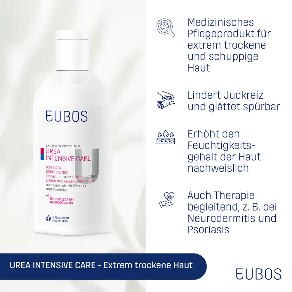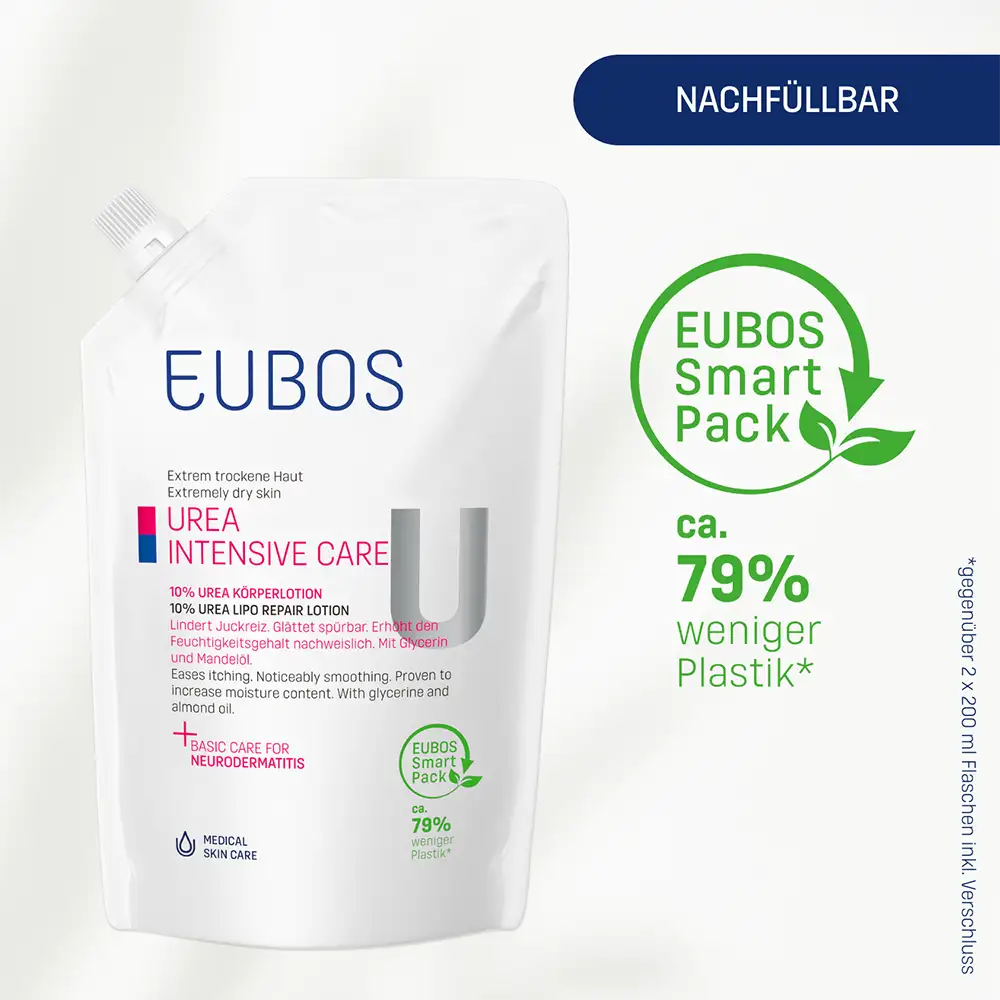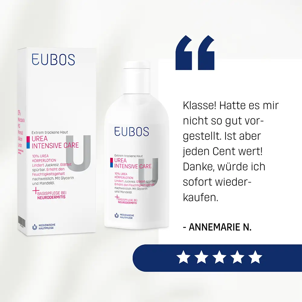 EUBOS UREA EMULSIONE LIPO REPAIR LOTION 10% è formulata per le esigenze della pelle estremamente secca e desquamata, che può risultare irritata, tesa o soggetta a prurito. La presenza di 10% di Urea e Glicerina aiuta a trattenere l’idratazione, leviga la superficie cutanea e contribuisce ad alleviare il prurito. Gli oli di Mandorla e gli oli esterificati apportano lipidi preziosi, mentre l’Allantoina aiuta a migliorare il comfort della pelle secca e sensibilizzata. La formula contribuisce ad aumentare il livello di idratazione della pelle e a migliorarne la morbidezza. È indicata come coadiuvante nel trattamento della pelle molto secca o irritata, anche in caso di dermatite atopica, pelle diabetica o xerosi senile. L’eccellente tollerabilità ed efficacia cosmetica sono confermate da test dermatologici. Tutti i prodotti del marchio EUBOS, dell’azienda familiare Dr. Hobein, sono realizzati in Germania dal 1930 e costantemente aggiornati secondo le più recenti conoscenze scientifiche.