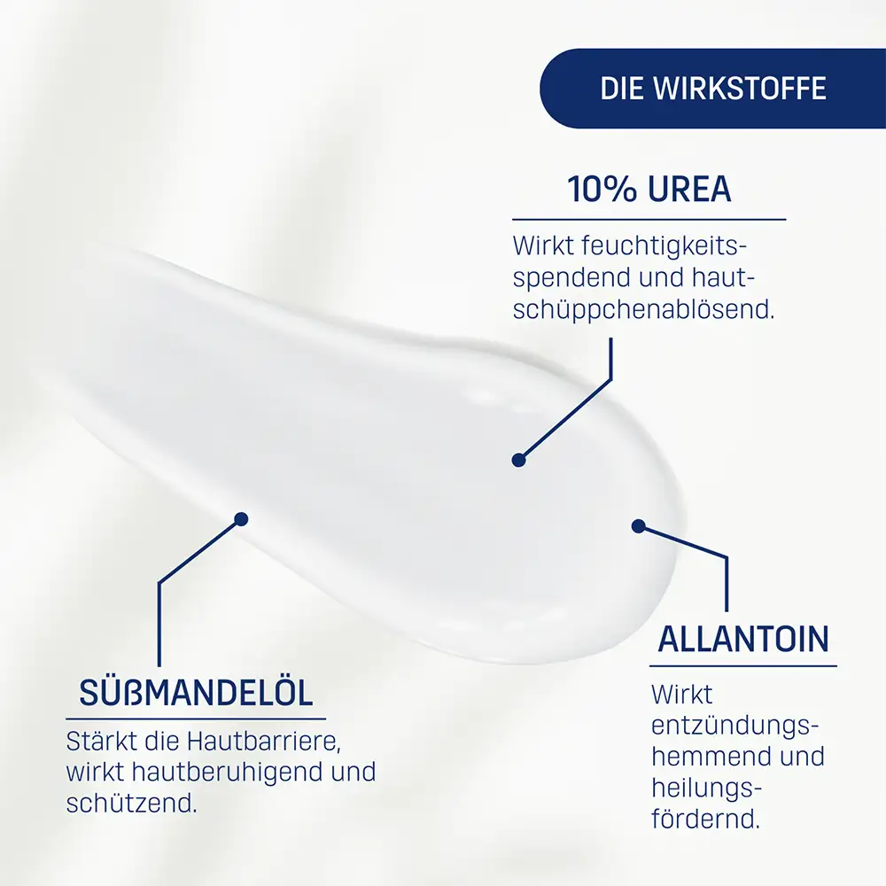 - Il 10% di Urea insieme alla Glicerina aiuta a trattenere l’idratazione, leviga la pelle e contribuisce ad alleviare il prurito.