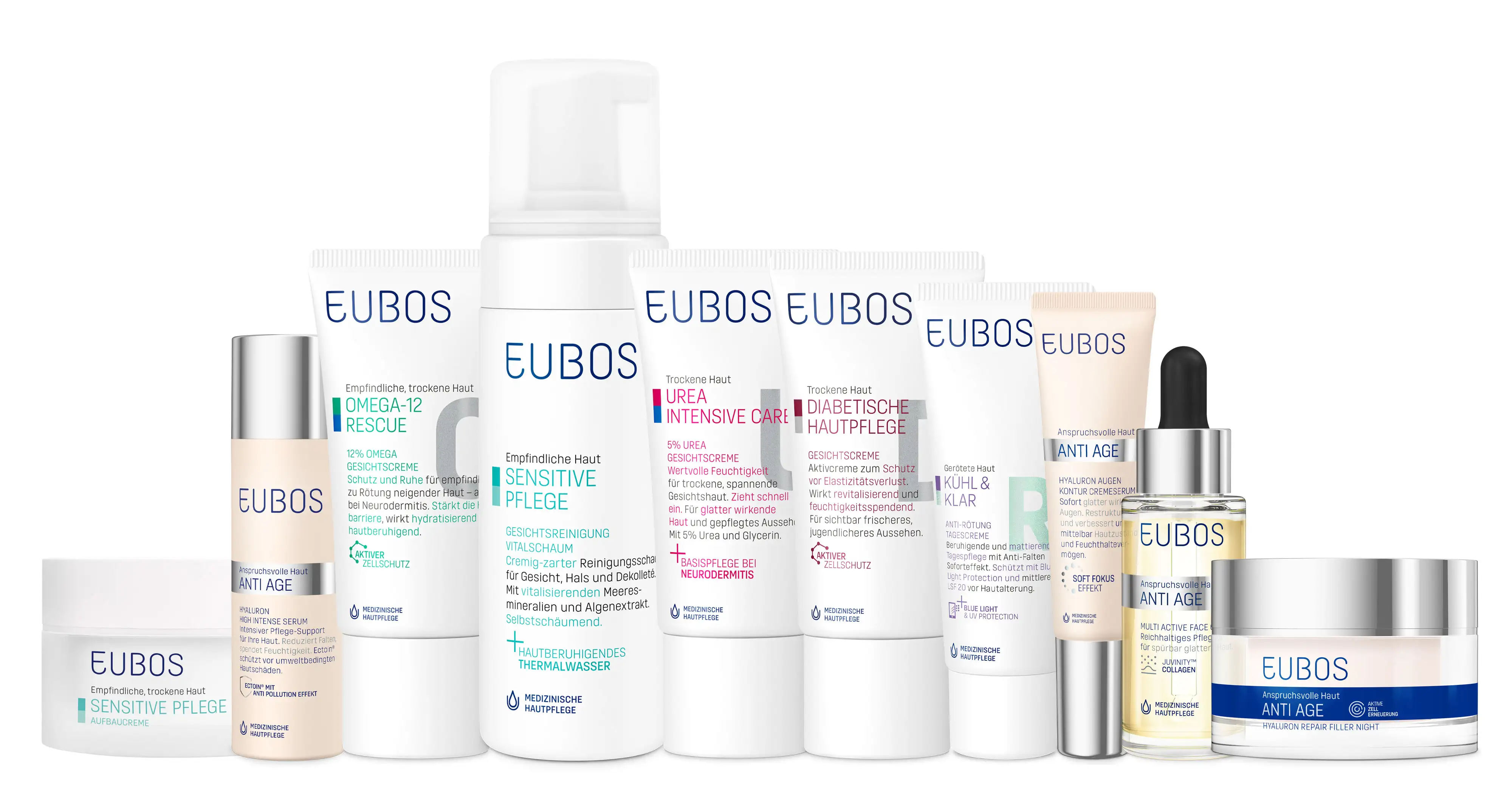 Ogni pelle è diversa – per questo i prodotti viso EUBOS sono studiati per rispondere alle specifiche esigenze cutanee. Dai trattamenti di base fino a quelli più intensivi con complessi di attivi altamente specializzati, i prodotti EUBOS per il viso contribuiscono a nutrire e prendersi cura della pelle in profondità. Con EUBOS BASE la pelle riceve un apporto mirato di idratazione; la linea ANTI AGE aiuta a contrastare i segni precoci dell’invecchiamento cutaneo grazie a creme rigeneranti e rimpolpanti, oli viso e sieri. Le fiale IN A SECOND contribuiscono a rendere la pelle immediatamente più liscia, compatta, nutrita e fresca. Le creme viso della linea UREA sono indicate per la pelle secca e sensibile. Per le pelli particolarmente delicate, come quelle dei bambini, EUBOS propone prodotti specializzati: EUBOS BABY PELLE SECCA è indicata come supporto cosmetico anche in caso di pelle a tendenza neurodermitica. È inoltre disponibile una crema viso sviluppata per la pelle a tendenza diabetica, mentre i prodotti della linea CALMA E SOLLIEVO sono pensati per la pelle reattiva.
